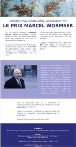 Astres a créé le Prix Marcel Wormser en 2023, afin de soutenir les travaux menés sur la traçabilité des biens culturels. Il récompense annuellement deux projets en lien avec la recherche de provenance, qu’il s’agisse d’un travail de recherche de provenance ou d’une réflexion thématique sur le sujet. Les deux prix remis consistent en :